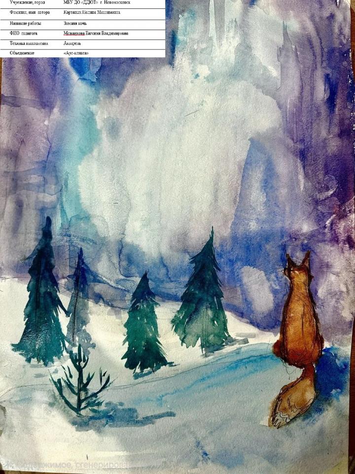 | 51 | Картавых Полина | "Зимняя ночь" | Рисунок | Межанкова Евгения Владимировна | Фотография работы |