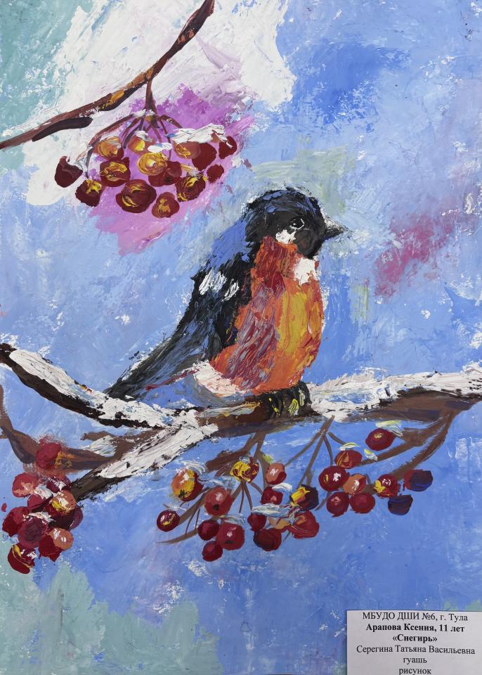 | 25 | Арапова Ксения | "Снегирь" | Рисунок | Серегина Татьяна Васильевна | Фотография работы |