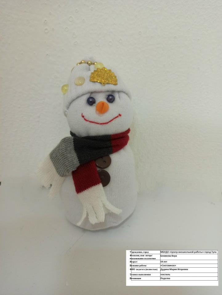 | 56 | Беникова Вера | "Снеговичок" | Поделка | Дудина Мария Игоревна | Фотограффия работы |