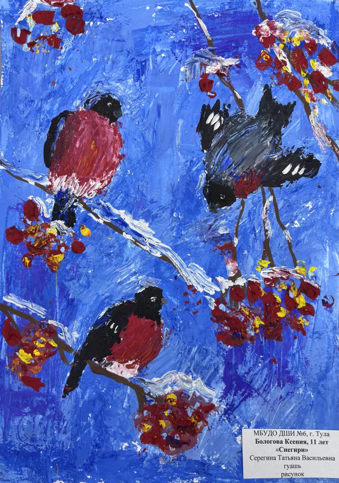 | 29 | Бологова Ксения | "Снегири" | Рисунок | Серегина Татьяна Васильевна | Фотография работы |