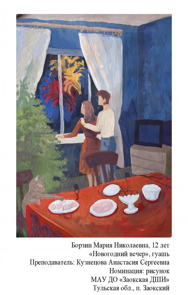 | 78 | Борзин Мария | "Новогодний вечер" | Рисунок | Кузнецова Анастасия Сергеевна | Фотография работы |