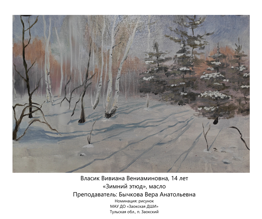 | 79 | Власик Вивиана | "Зимний этюд" | Рисунок | Бычкова Вера Анатольевна | Фотография работы |