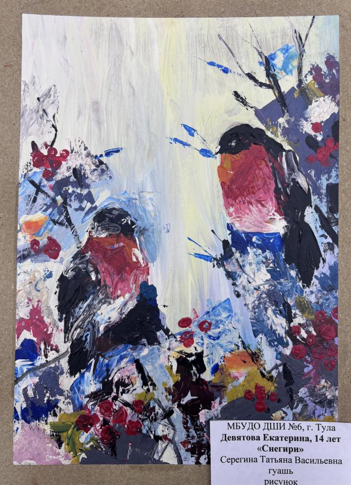 | 30 | Девятова Екатерина | "Снегири" | Рисунок | Серегина Татьяна Васильевна | Фотография работы |