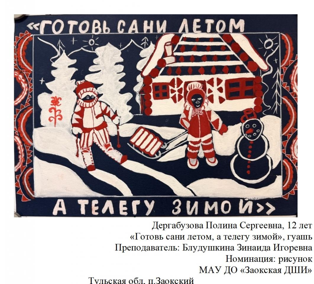 | 80 | Дергабузова Полина | "Готовь сани летом, а телегу зимой" | Рисунок | Блудушкина Зинаида Игоревна | Фотография работы |