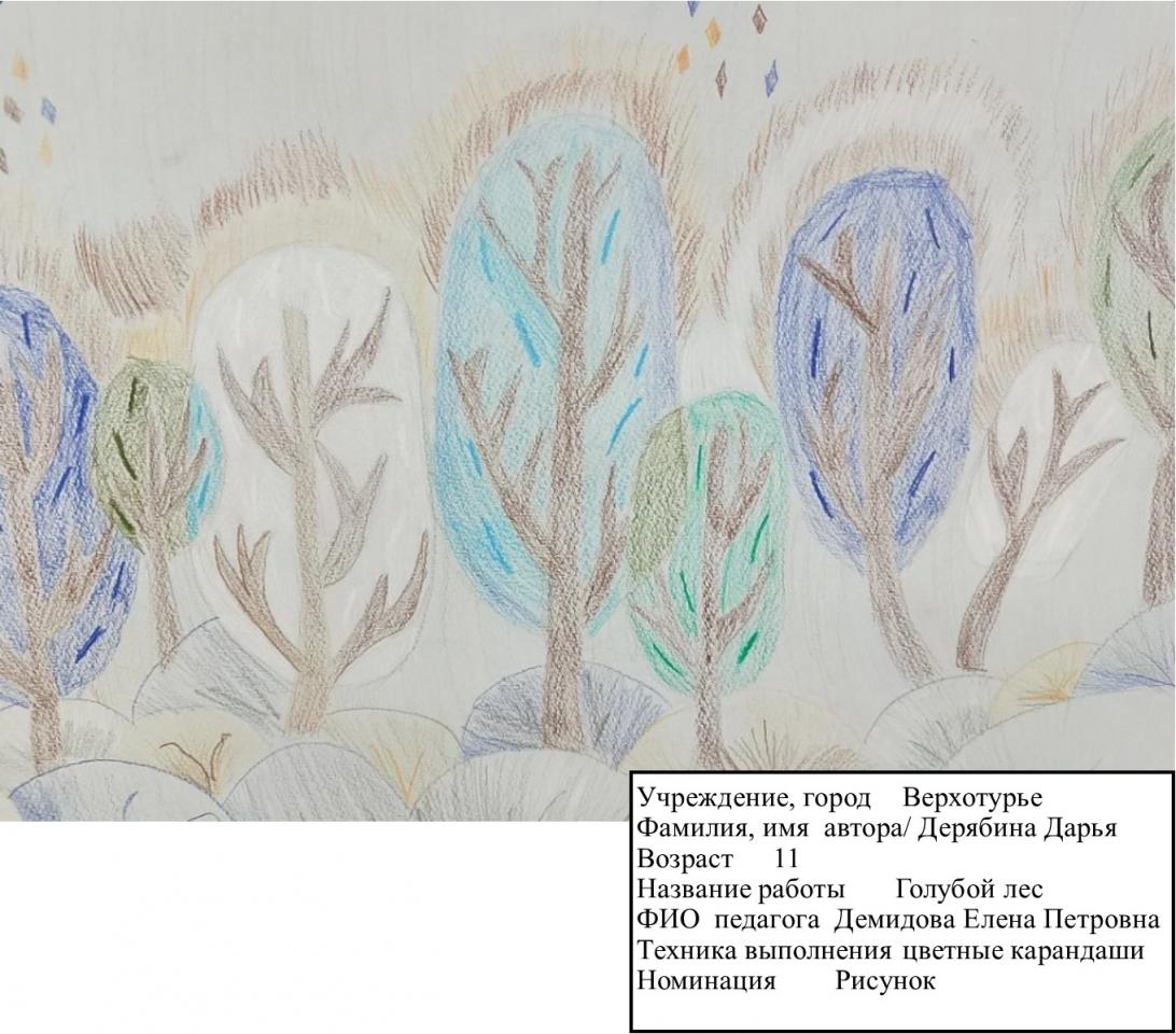| 42 | Дерябина Дарья | "Голубой лес" | Рисунок | Демидова Елена Петровна | Фотография работы |