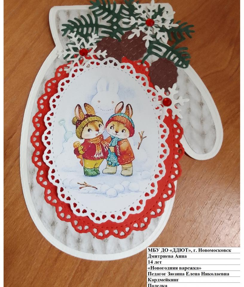 | 48 | Дмитриева Анна | "Новогодняя варежка" | Поделка | Зюзина Елена Николаевна | Фотография работы |