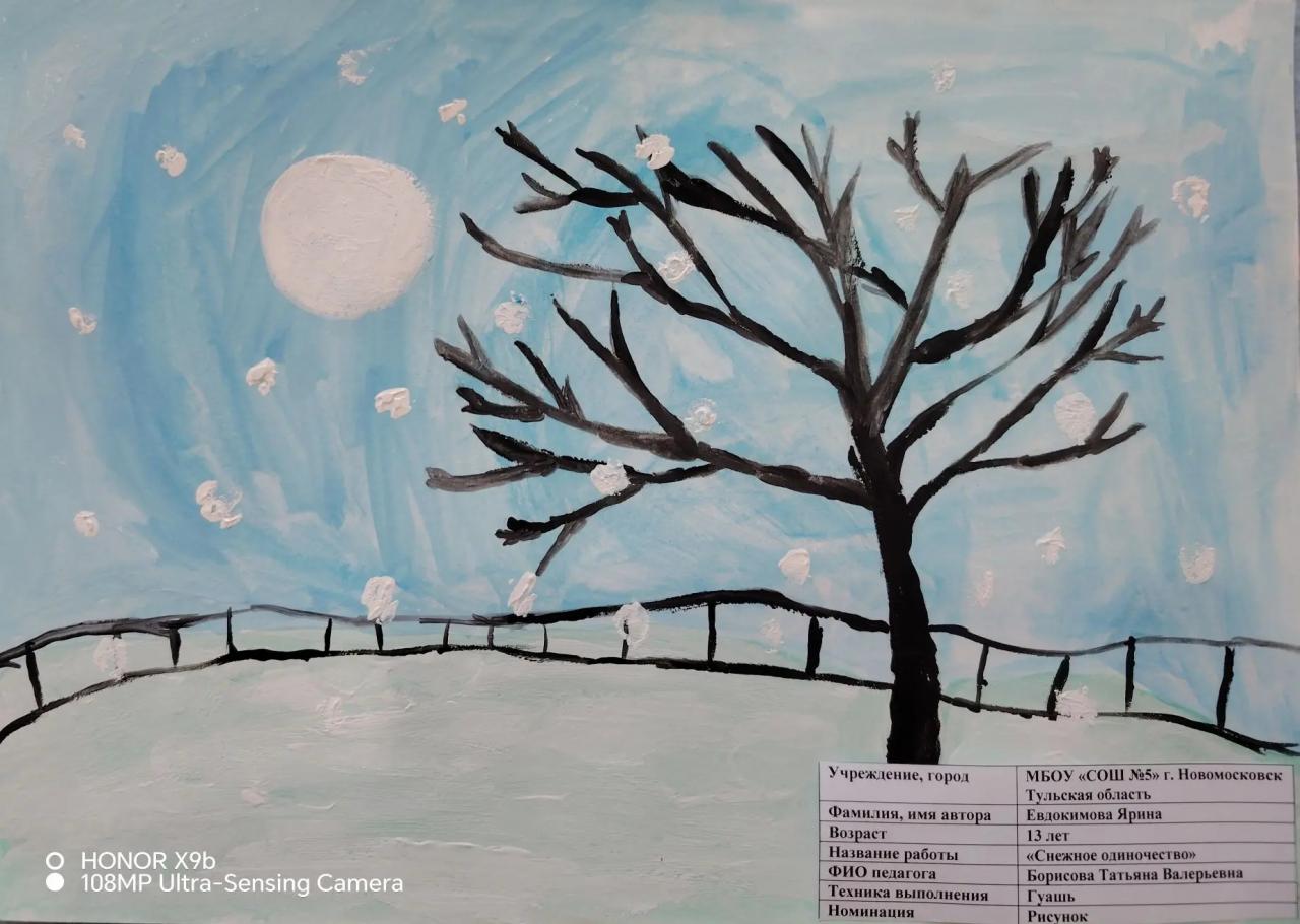 | 65 | Евдокимова Ярина | "Снежное одиночество" | Рисунок | Борисова Татьяна Валерьевна | Фотография работы |