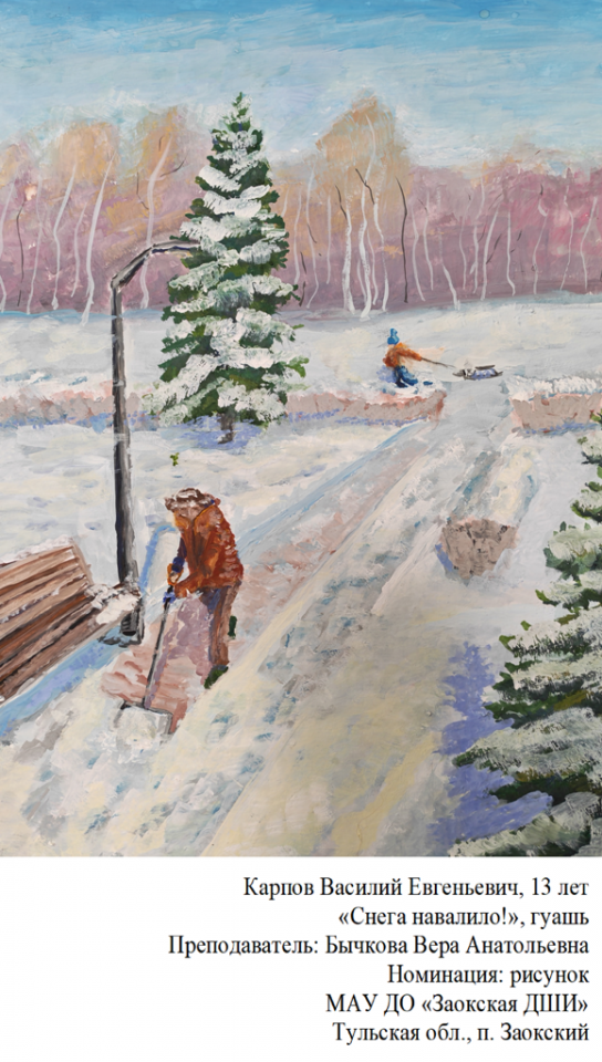 | 83 | Карпов Василий | "Снега навалило!" | Рисунок | Бычкова Вера Анатольевна | Фотография работы |