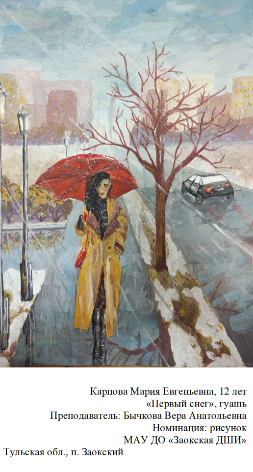 | 84 | Карпова Мария | "Первый снег" | Рисунок | Бычкова Вера Анатольевна | Фотография работы |