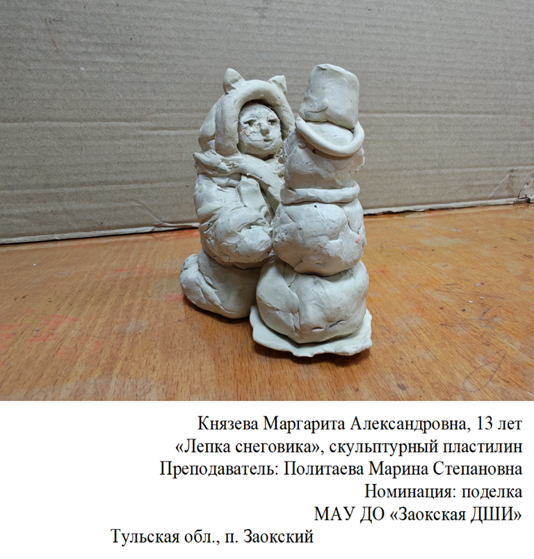| 85 | Князева Маргарита | "Лепка снеговика" | Поделка | Политаева Марина Степановна | Фотография работы |