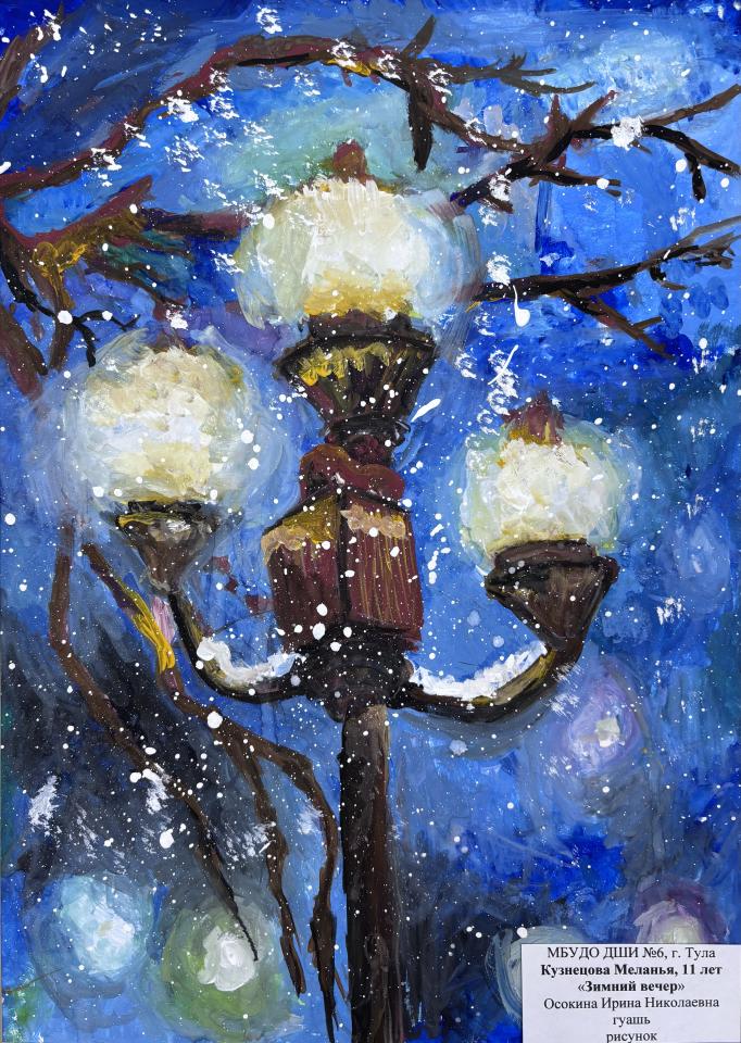 | 10 | Кузнецова Меланья | "Зимний вечер" | Рисунок | Осокина Ирина Николаевна | Фотография работы |