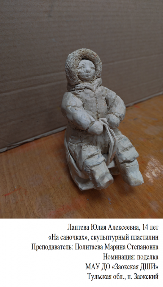 | 86 | Лаптева Юлия | "На саночках" | Поделка | Политаева Марина Степановна | Фотография работы |
