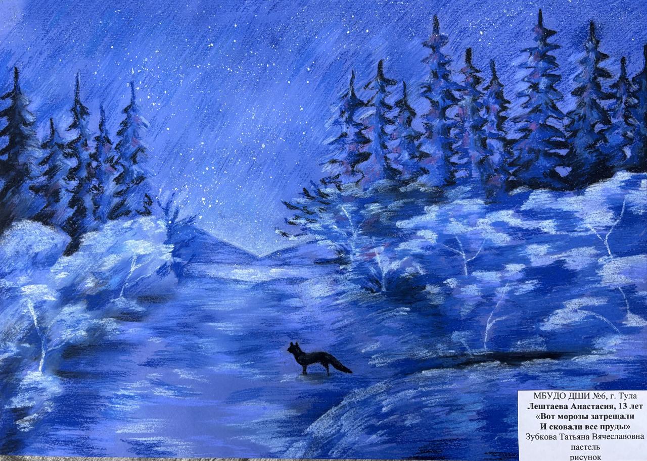 | 16 | Лештаева Анастасия | "Вот морозы затрещали и сковали все пруды" | Рисунок | Зубкова Татьяна Вячеславовна | Фотография работы |