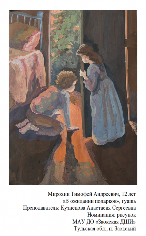 | 87 | Мирохин Тимофей | "В ожидании подарков" | Рисунок | Кузнецова Анастасия Сергеевна | Фотография работы |