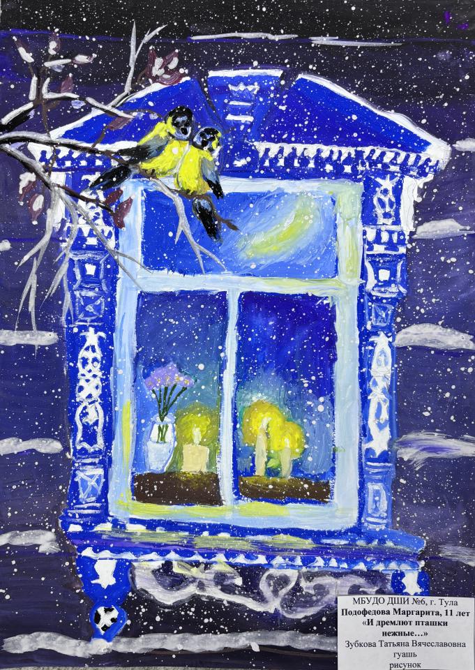 | 18 | Подофедова Маргарита | "И дремлют пташки нежные..." | Рисунок | Зубкова Татьяна Вячеславовна | Фотография работы |