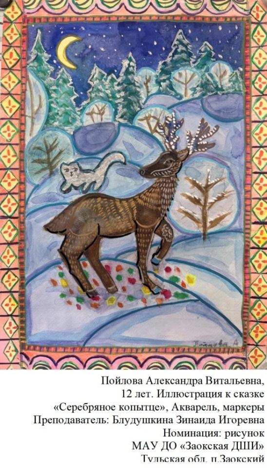 | 89 | Пойлова Александра | Иллюстрация к сказке "Серебряное копытце" | Рисунок | Блудушкина Зинаида Игоревна | Фотография работы |