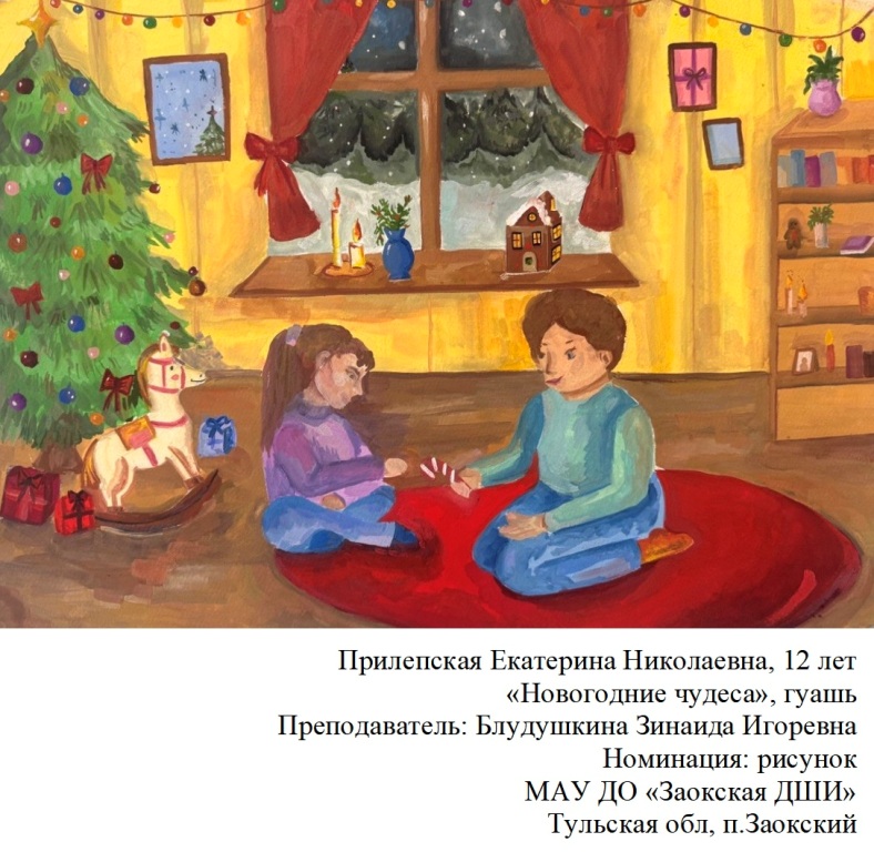 | 92 | Прилепская Екатерина | "Новогодние чудеса" | Рисунок | Блудушкина Зинаида Игоревна | Фотография работы |