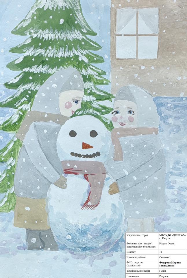 | 38 | Родина Олеся | "Снеговик" | Рисунок | Федорова Марина Геннадиевна | Фотография работы |