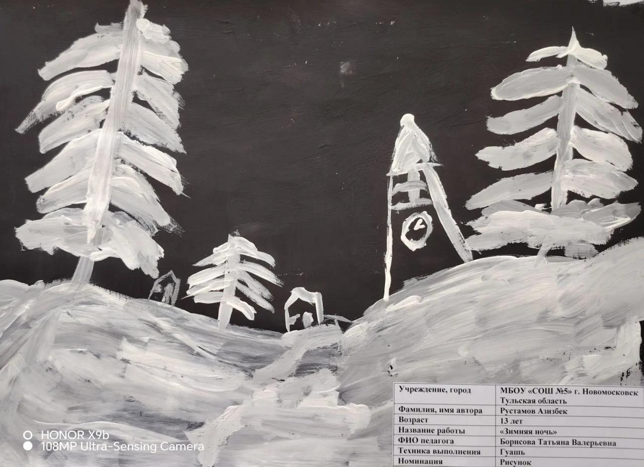 | 62 | Рустамов Азизбек | "Зимняя ночь" | Рисунок | Борисова Татьяна Валерьевна | Фотография работы |