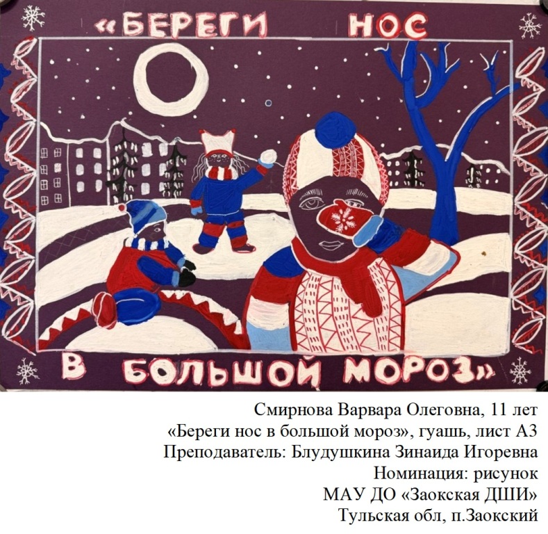 | 94 | Смирнова Варвара | "Береги нос в большой мороз" | Рисунок | Блудушкина Зинаида Игоревна | Фотография работы |