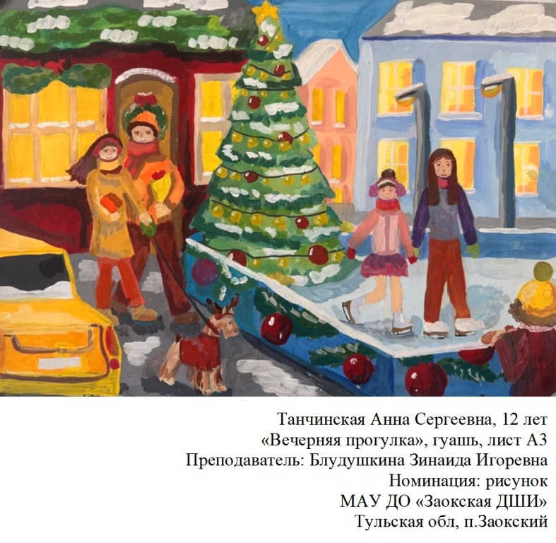 | 95 | Тачинская Анна | "Вечерняя прогулка" | Рисунок | Блудушкина Зинаида Игоревна | Фотография работы |
