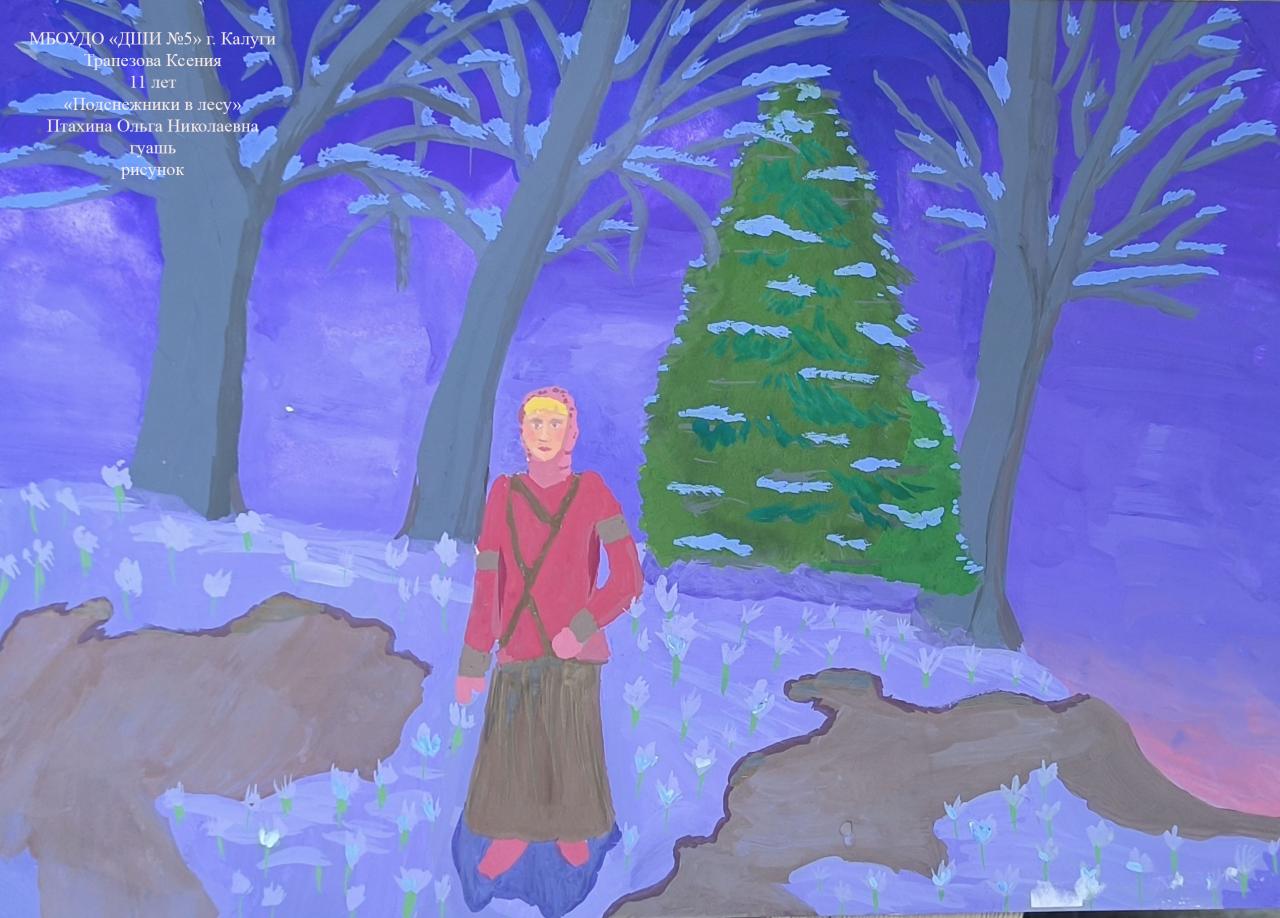 | 35 | Трапезова Ксения | "Подснежники в лесу" | Рисунок | Птахина Ольга Николаевна | Фотография работы |