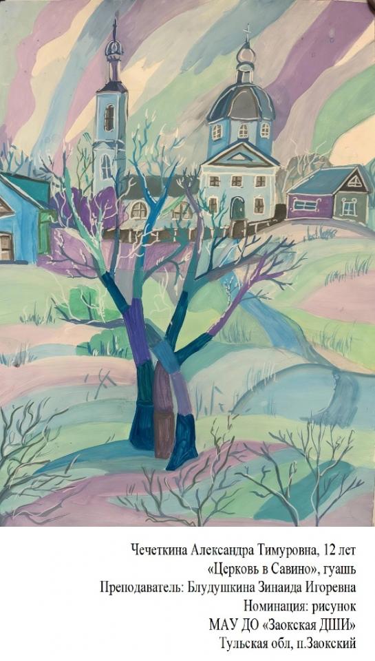 | 97 | Чечеткина Александра | "Церковь в Савино" | Рисунок | Блудушкина Зинаида Игоревна | Фотография работы |