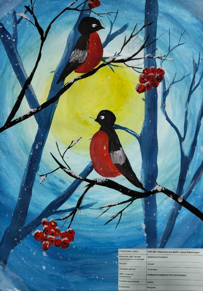 | 54 | Шевелина Елизавета | "Снегири" | Рисунок | Райфикестр Дарина Константиновна | Фотография работы |