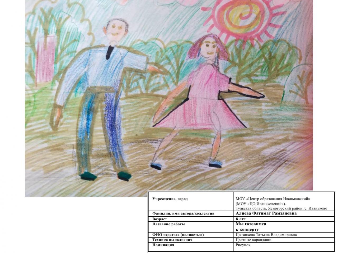 | 4 | Алиева Фатимат | В обработке | "Мы готовимся к концерту" | Рисунок | Цыганкова Татьяна Владимировна | Принята | Фотография работы |