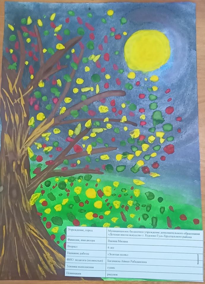 | 37 | Васина Милана | В обработке | "Золотая осень" | Рисунок | Багамаева Айшат Рабадановна | Принята | Фотография работы |