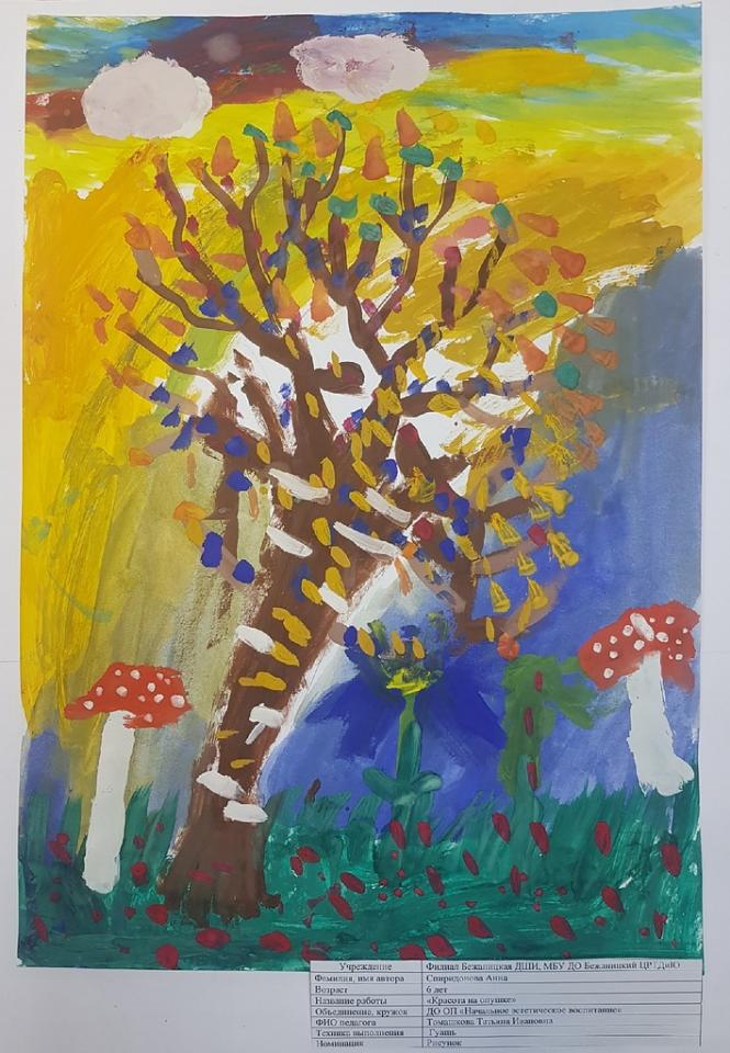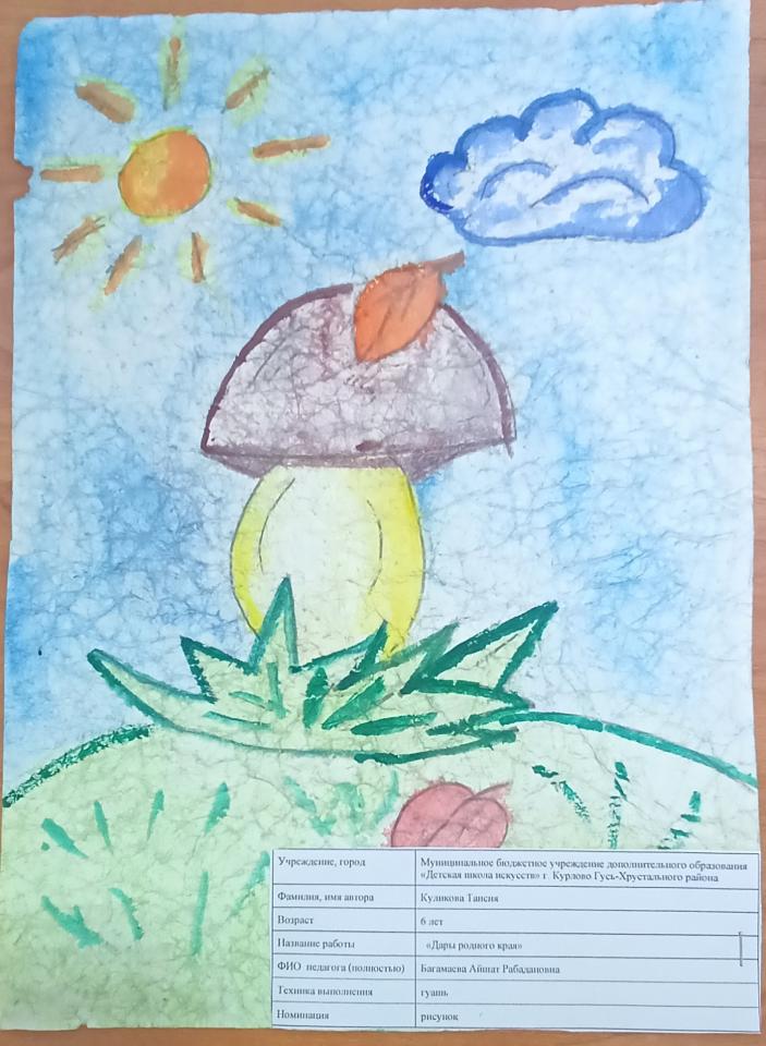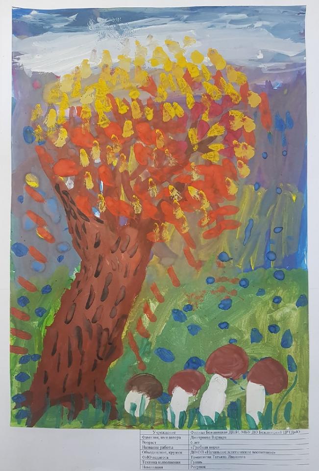 | 66 | Дмитриева Варвара | В обработке | "Грибная пора" | Рисунок | Томашкова Татьяна Ивановна | Принята | Фотография работы |