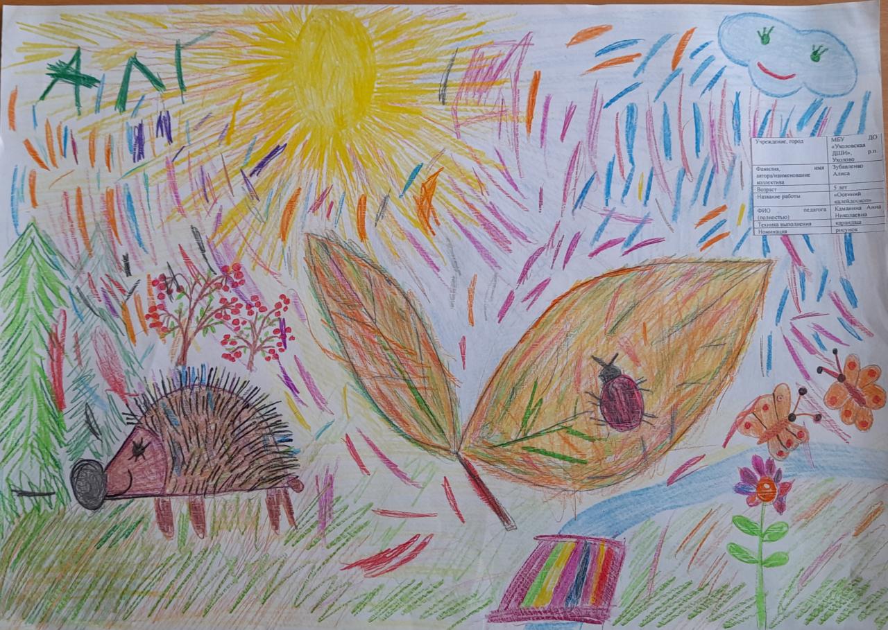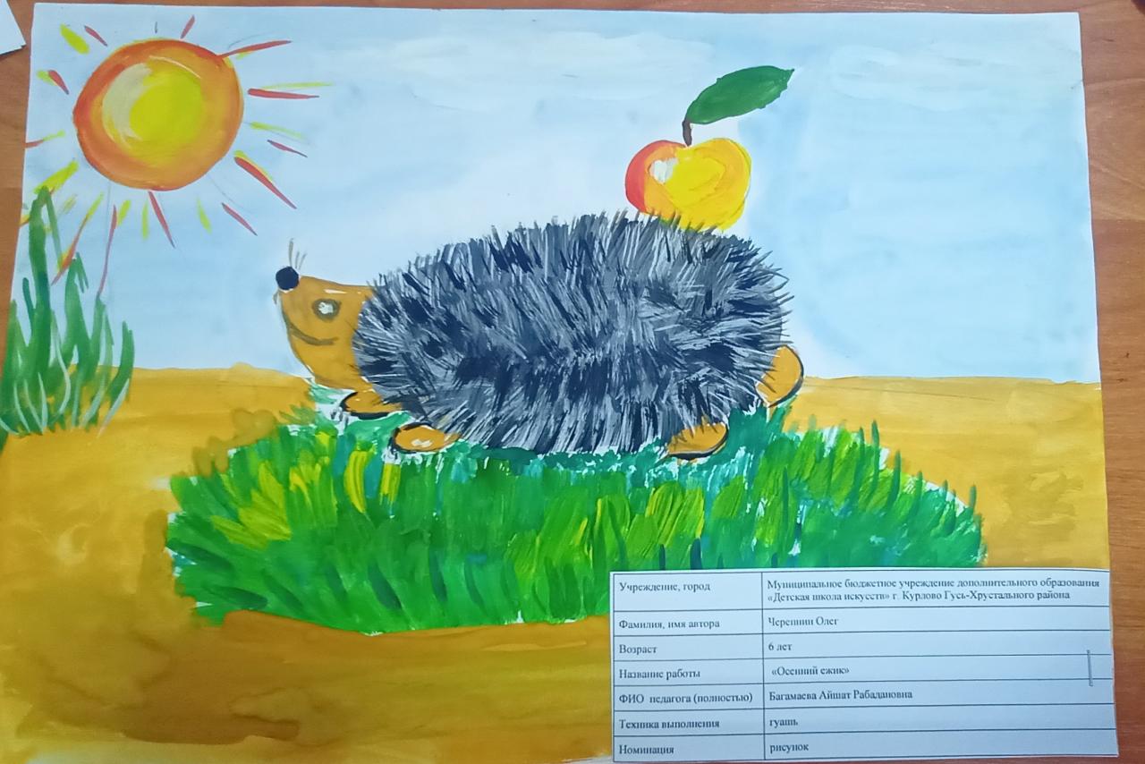 | 39 | Черепин Олег | В обработке | "Осенний ёжик" | Рисунок | Багамаева Айшат Рабадановна | Принята | Фотография работы |