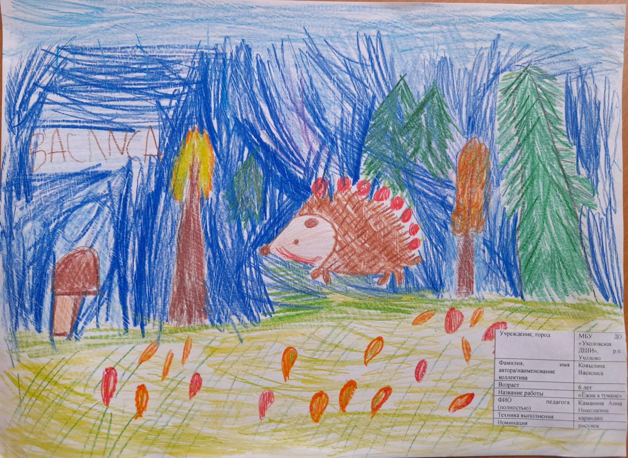 | 51 | Ковылина Василиса | В обработке | "Ёжик в тумане" | Рисунок | Каманина Анна Николаевна | Принята | Фотография работы |