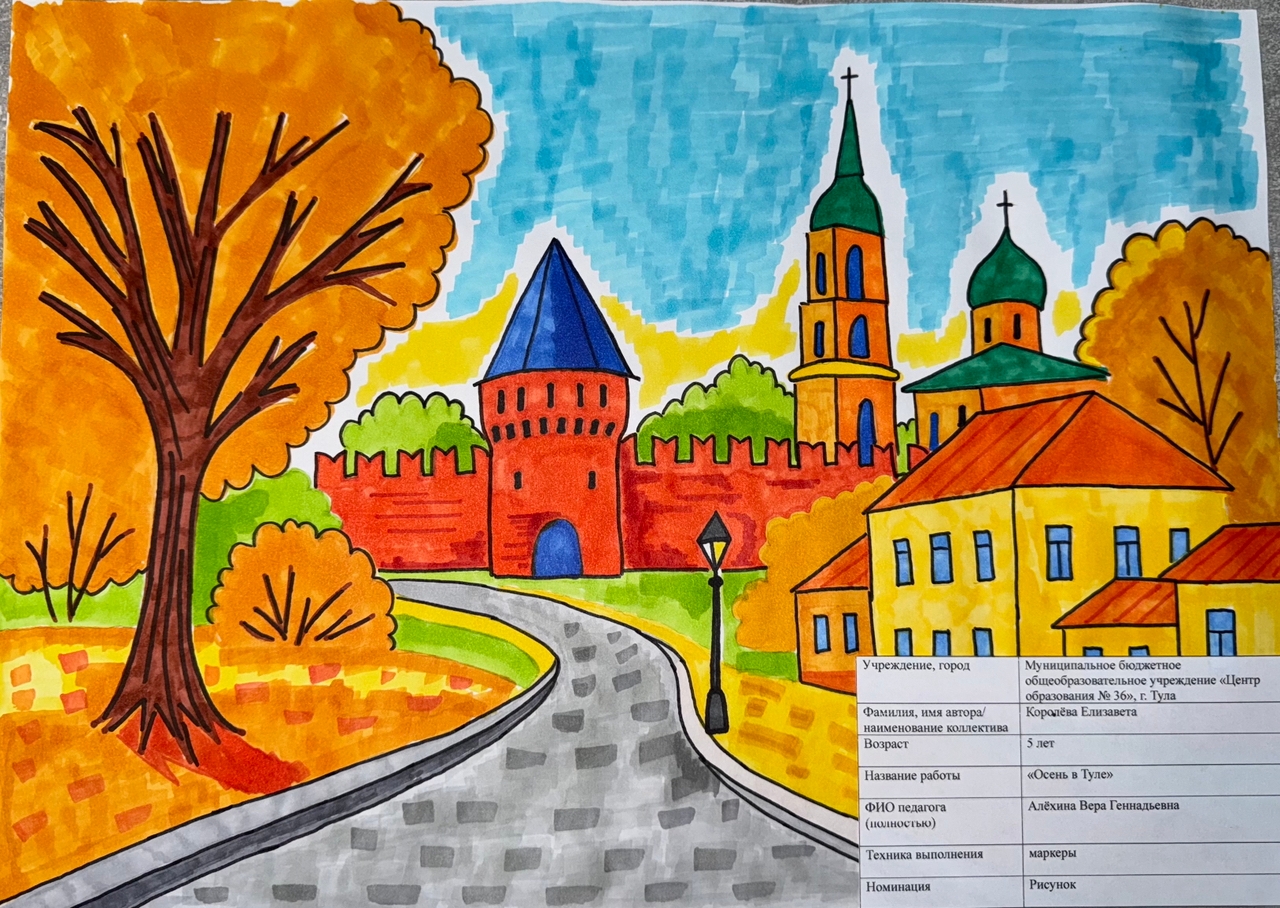 | 59 | Королёва Елизавета | В обработке | "Осень в Туле" | Рисунок | Алёхина Вера Геннадьевна | Принята | Фотография работы |