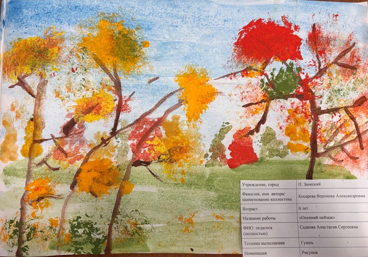 | 67 | Косарева Вероника | В обработке | "Осенний пейзаж" | Рисунок | Садкова Анастасия Сергеевна | Принята | Фотография работы |