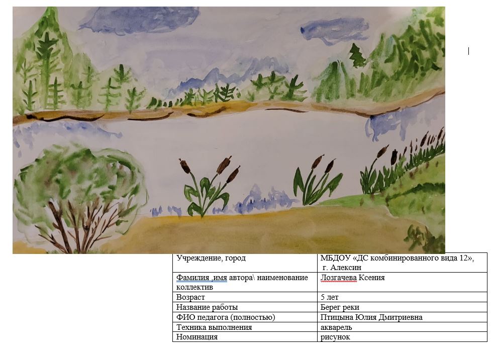 | 22 | Лозгачева Ксения | В обработке | "Берег реки" | Рисунок | Птицына Юлия Дмитриевна | Принята | Фотография работы |