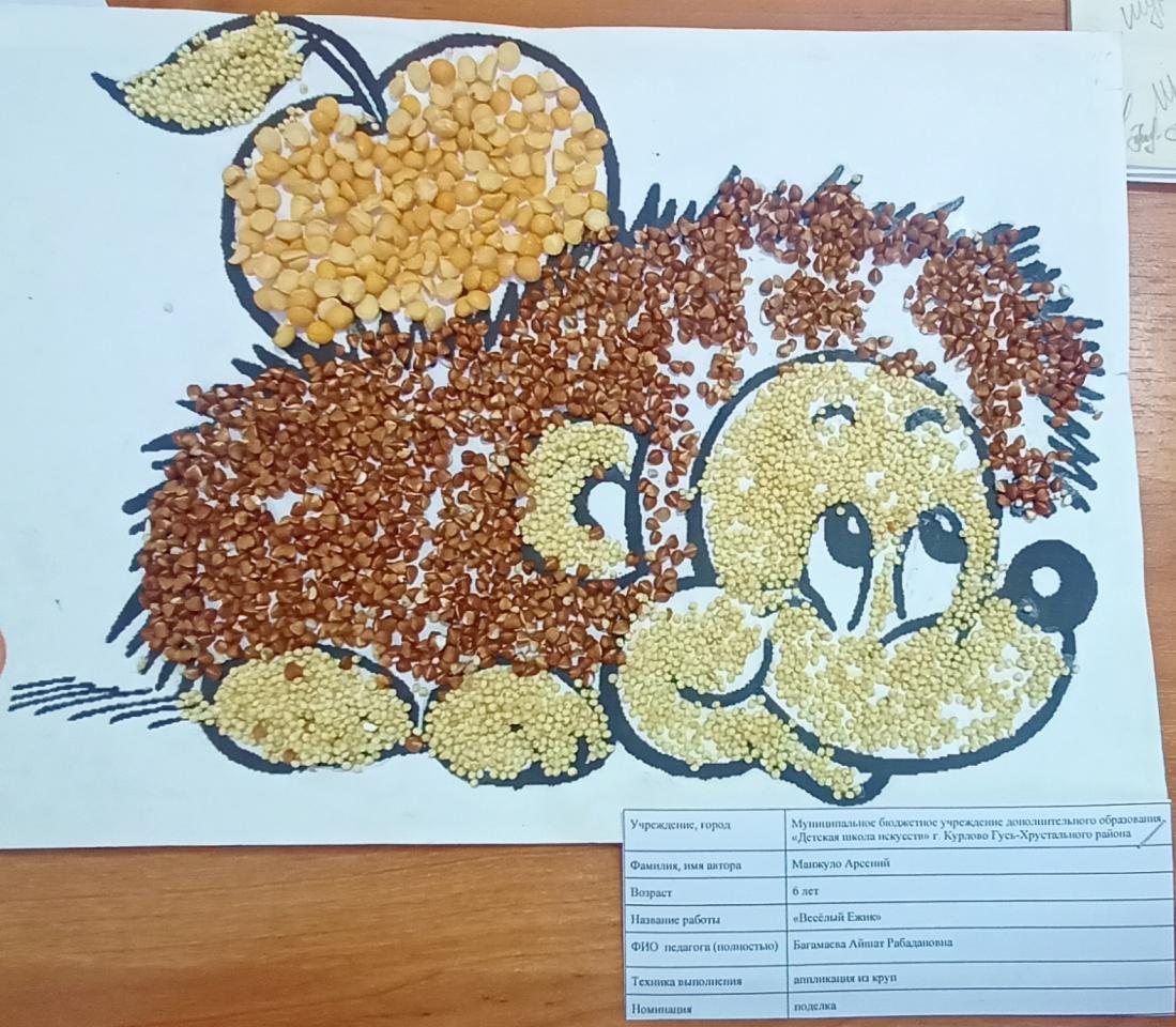 | 38 | Манжуло Арсений | В обработке | "Весёлый ёжик" | Поделка | Багамаева Айшат Рабадановна | Принята | Фотография работы |