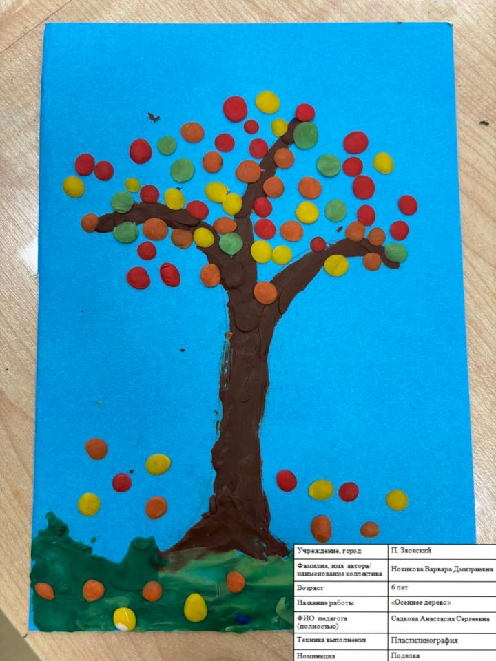| 68 | Новикова Варвара | В обработке | "Осеннее дерево" | Поделка | Садкова Анастасия Сергеевна | Принята | Фотография работы |