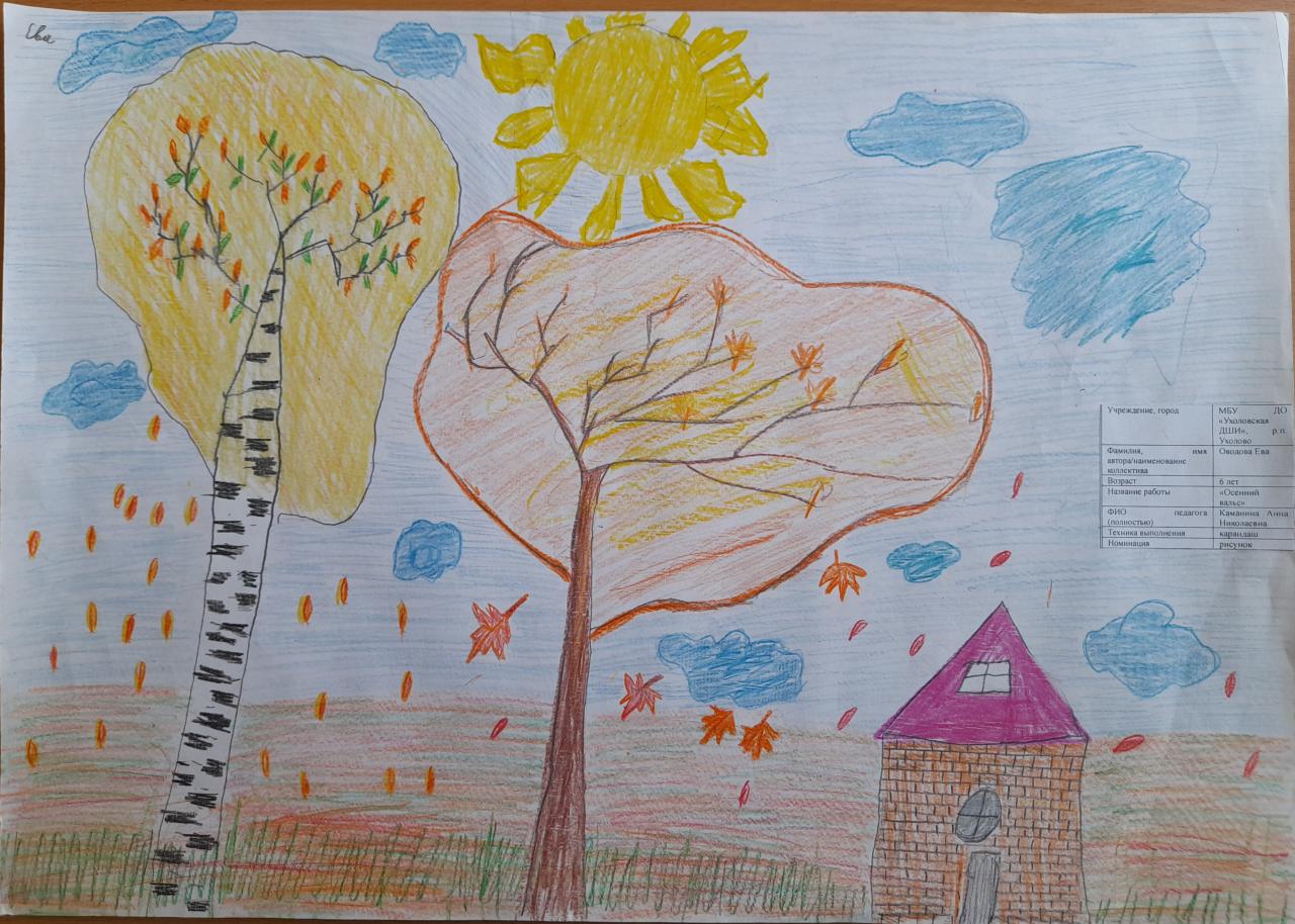 | 53 | Оводова Ева | В обработке | "Осенний вальс" | Рисунок | Каманина Анна Николаевна | Принята | Фотография работы |