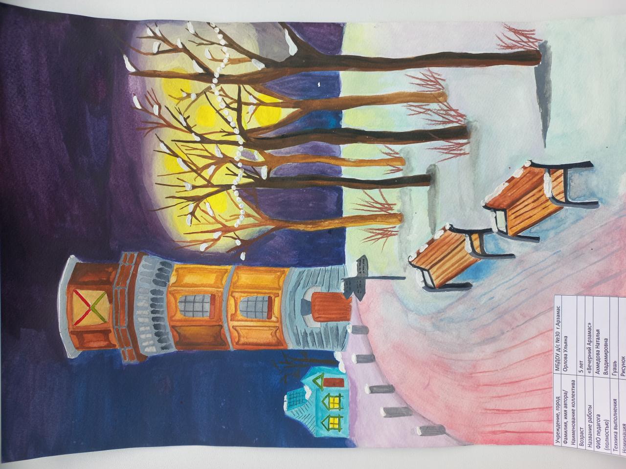 | 31 | Орлова Ульяна | В обработке | "Вечерний Арзамас" | Рисунок | Ахмедова Наталья Владимировна | Принята | Фотография работы |