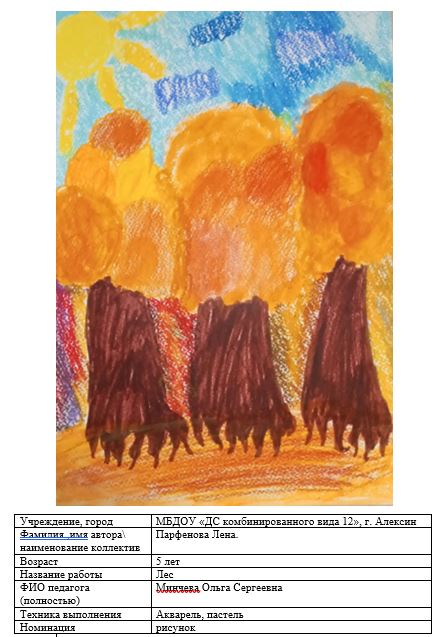 | 21 | Парфенова Елена | В обработке | "Лес" | Рисунок | Минчева Ольга Сергеевна | Принята | Фотография работы |