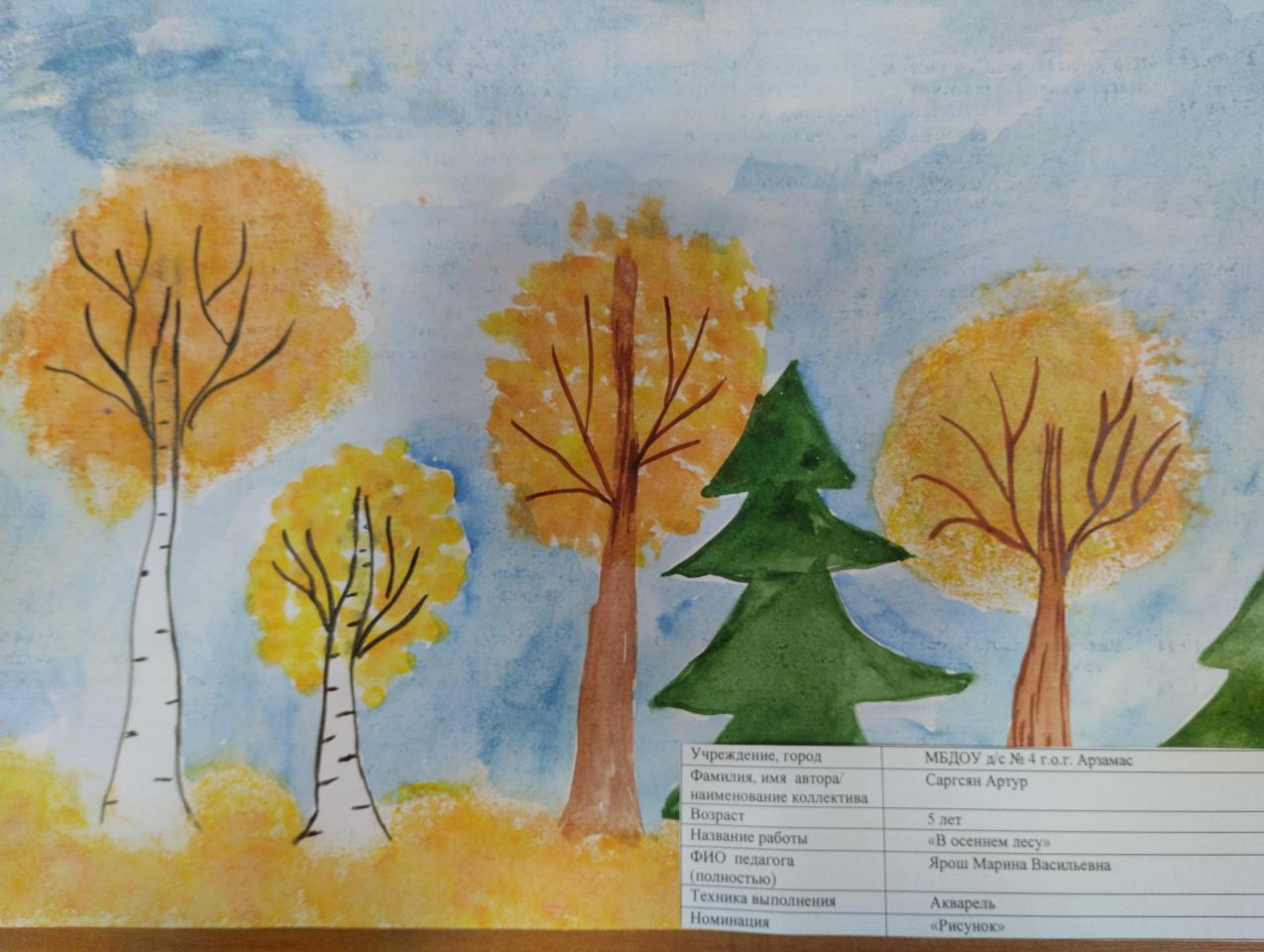 | 7 | Саргасян Артур | В обработке | "В осеннем лесу" | Рисунок | Ярош Марина Васильевна | Принята | Фотография работы |