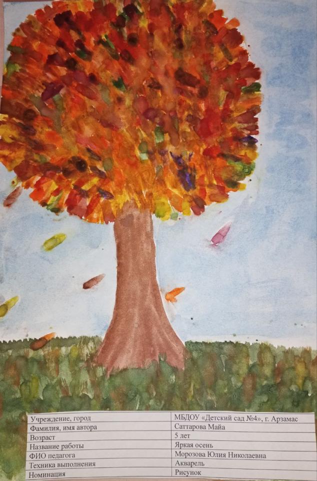 | 8 | Саттарова Майя | В обработке | "Яркая осень" | Рисунок | - | Принята | Фотография работы |