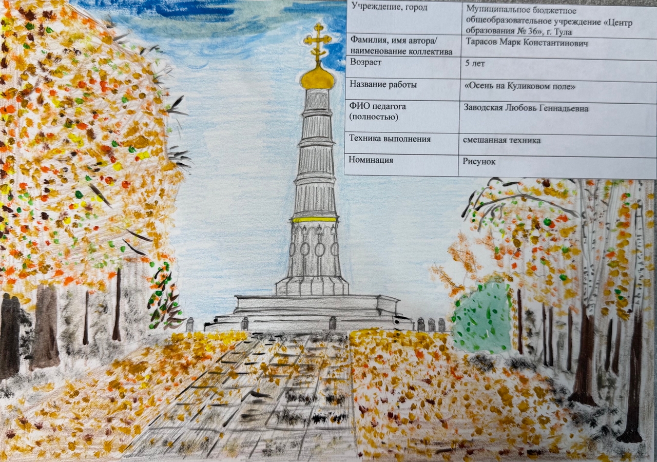 | 61 | Тарасов Марк | В обработке | "Осень на Куликовом поле" | Рисунок | Заводская Любовь Геннадьевна | Принята | Фотография работы |