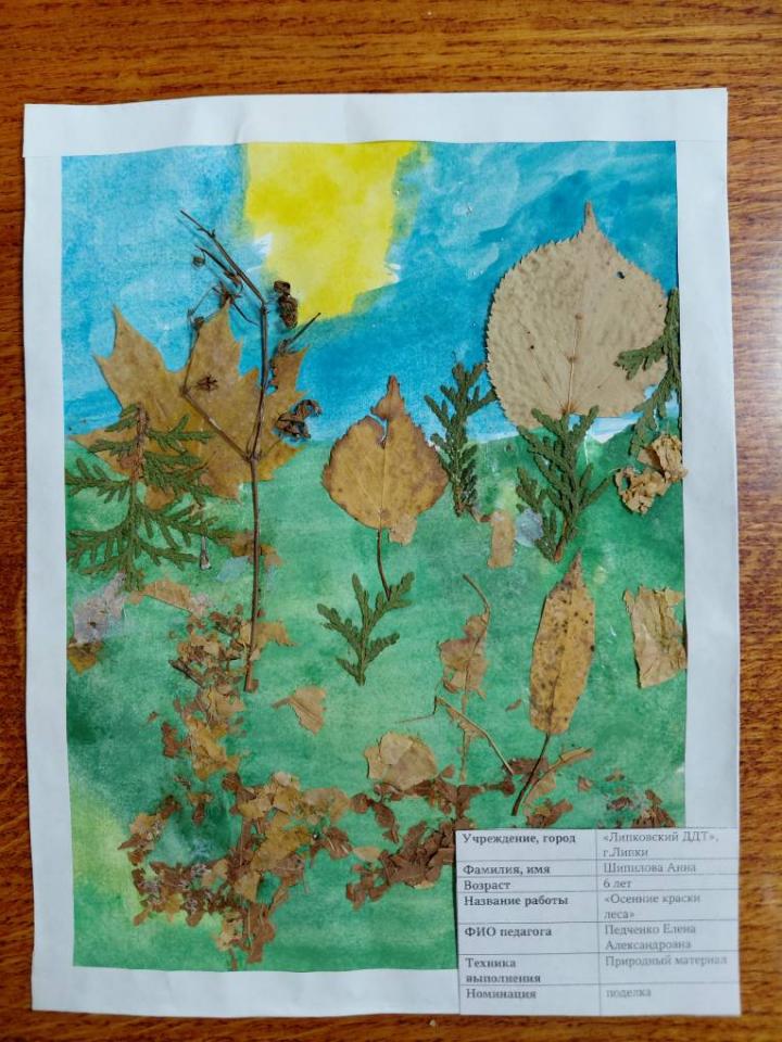 | 33 | Шипилова Анна | В обработке | "Осенние краски леса" | Поделка | Педченко Е.А. | Принята | Фотография работы |