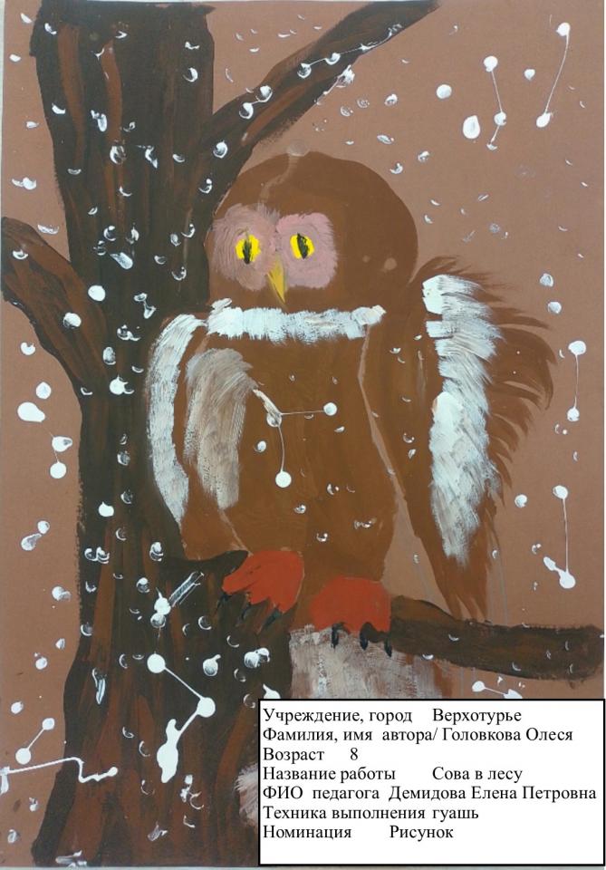 32 Головкова Олеся "Сова в лесу" Рисунок Демидова Елена Петровна Фотография работы