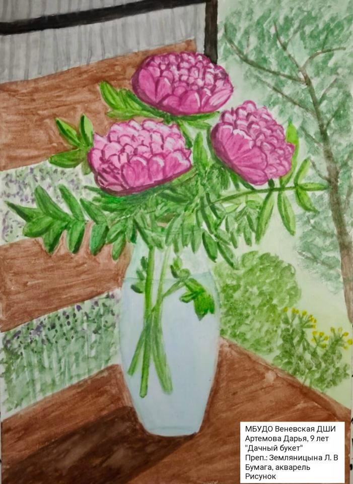 | 101 | Артёмова Дарья | В обработке | "Дачный букет" | Рисунок | Земляницына Любовь Владимировна | Принята | Фото работы |