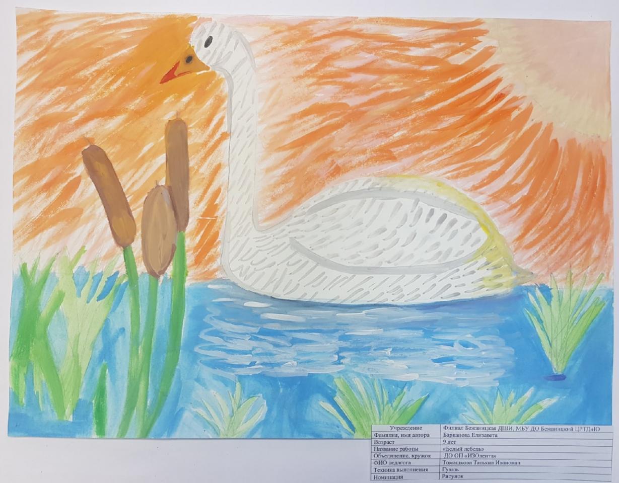 | 105 | Барканова Елизавета | В обработке | "Белый лебедь" | Рисунок | Томашкова Татьяна Ивановна | Принята | Фото работы |