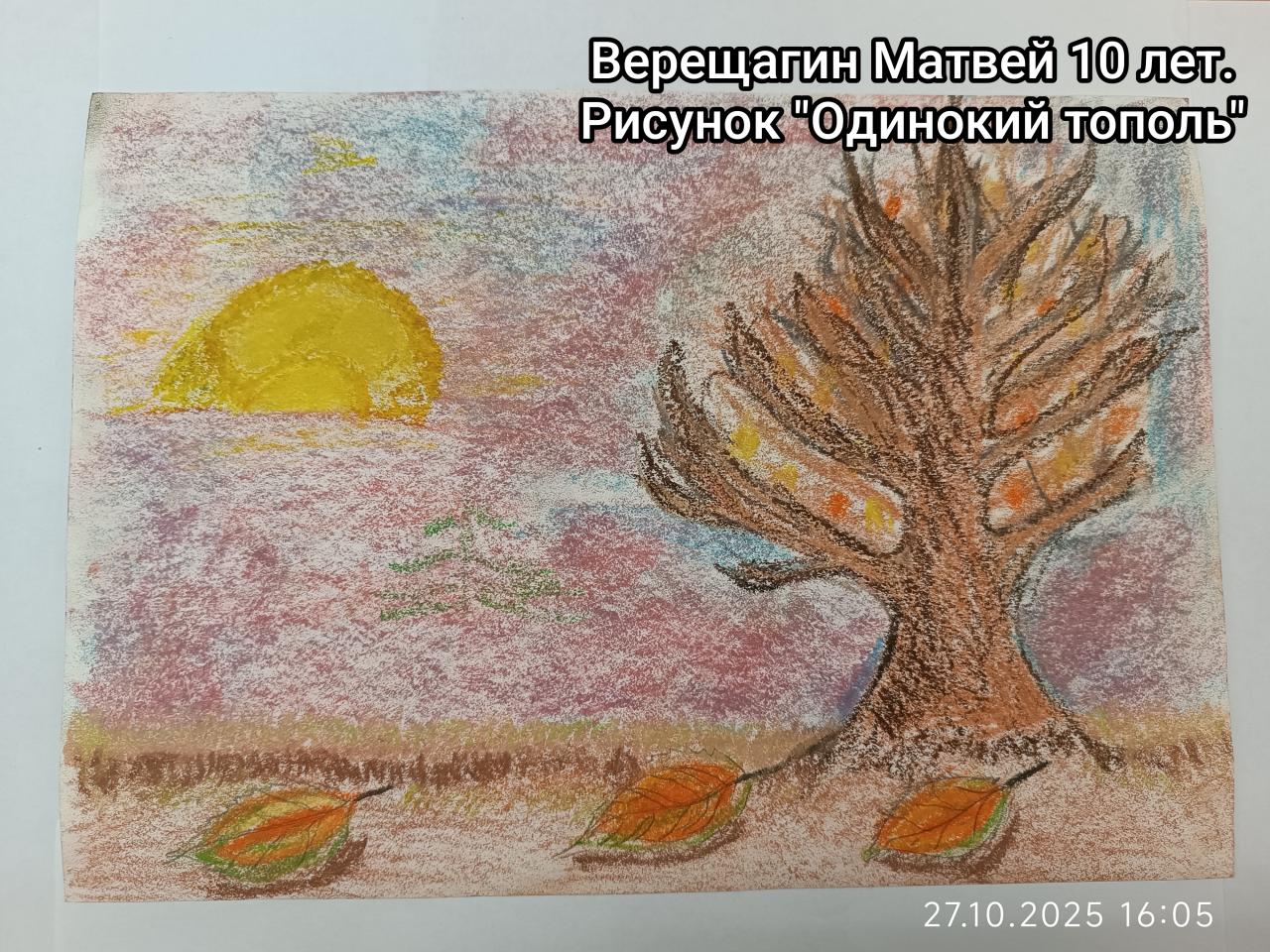| 19 | Верещагин Матвей | В обработке | "Одинокий тополь" | Рисунок | Стрекаловская Виктория Петровна | Принята | Фото работы |