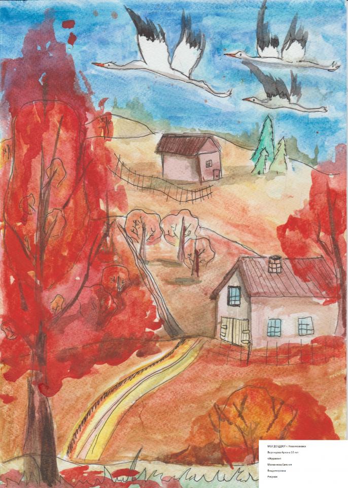 | 60 | Брушко Дарья | В обработке | "Осенние гости" | Рисунок | Межанкова Евгения Владимировна | Принята | Фото работы |